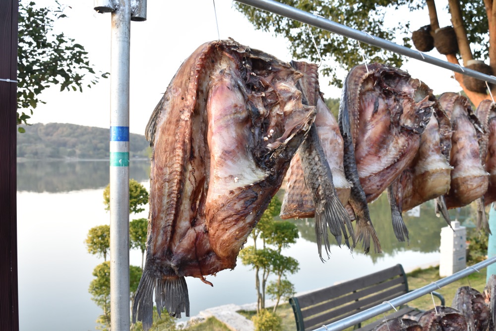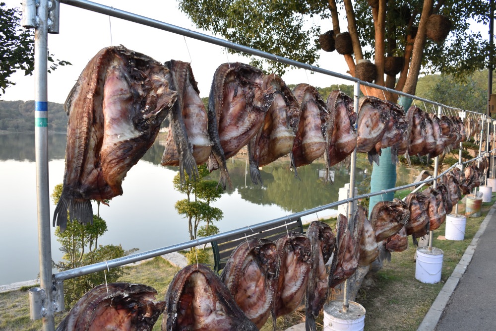 もうちょっと暗くなるまで待っている間にとりました。レストランの前で、魚を日干しにしています。