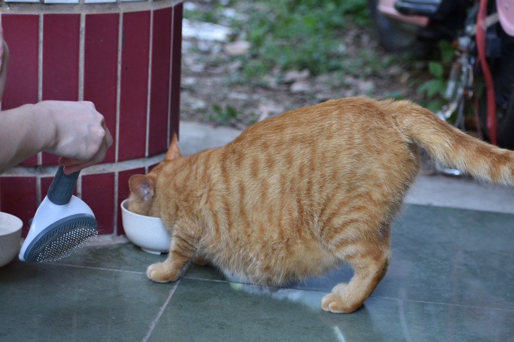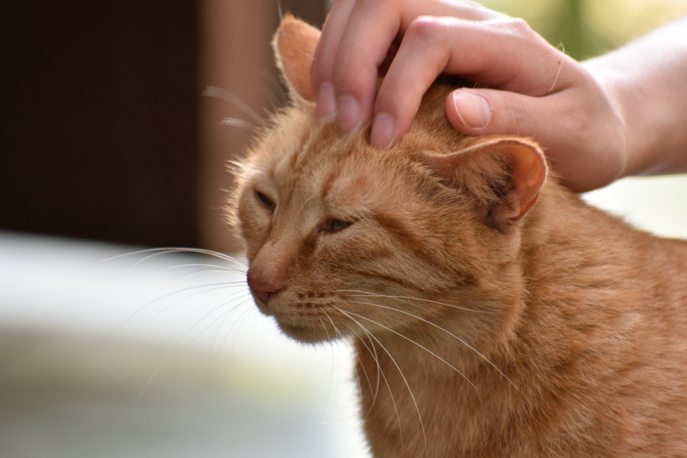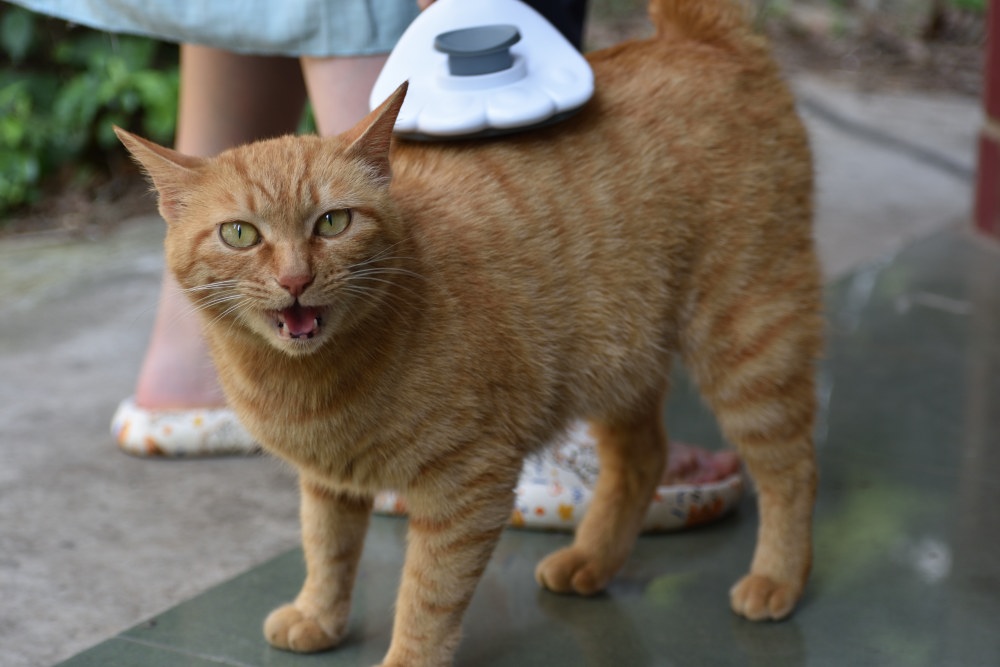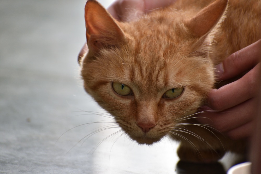 ご飯を食べて、眠そうにしています。このネコ、人相でなはく、猫相が悪く、なでられて気持ちがいいはずなのに、顔が怖いです。