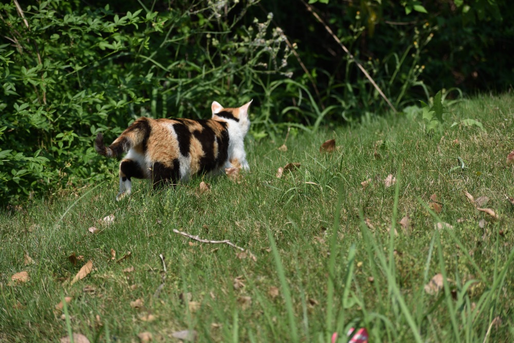 おなかがいっぱいになり、どうやら子ネコのところに帰りそうなので、あとをつけてみました。信頼している人には子ネコの居場所を教えてくれるそうですが、どうやら信頼してもらってない様子。あんなにえさをあげてるのにっ!